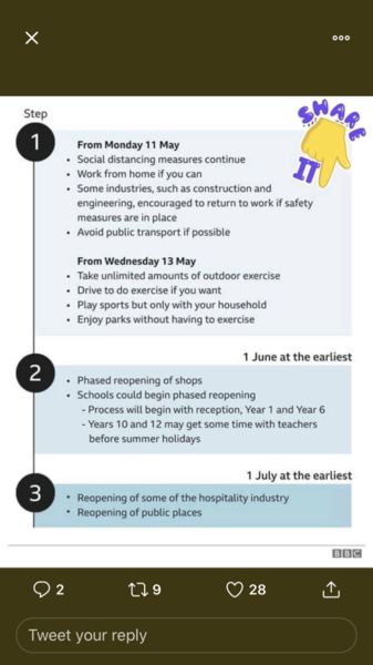 I’ve been fighting this battle on two threads. I listened to the speech. BJ said people can return to work on Wednesday. I don’t understand why people are saying they can go to work today! They can’t because he said Wednesday, and he said from Wednesday, so not necessarily on Wednesday, only if social distancing measures are in place by Wednesday. And only if a person can’t work from home. If you can work from home, continue to work from home.