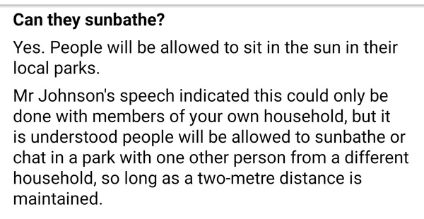 As widely expected, people will be formally allowed to go out for exercise more than once a day. In addition, people will be permitted to meet and sit down with one other person, outdoors, if they remain two metres apart. The new rules will start on Wednesday, when people can undertake “unlimited amounts of outdoor exercise”, and sunbathe or drive to destinations for exercise. Sports including angling, swimming in lakes and rivers, tennis and golf will also be allowed, but only within household groups.‘