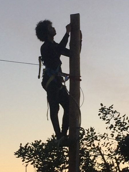 I’ve frequently thought that our internet access is the Portuguese equivalent of Kintyre. Definitely has a mind of its own, but things might be changing. There has just been a nice young man (well he had a very cheerful smile) climbing and changing the wires on the telegraph pole outside that supplies our cable internet access. I’ve added a photograph but it doesn’t show the long hooks on his shoes very well. It was fascinating to watch how he managed to scale and and carryon working on the pole.