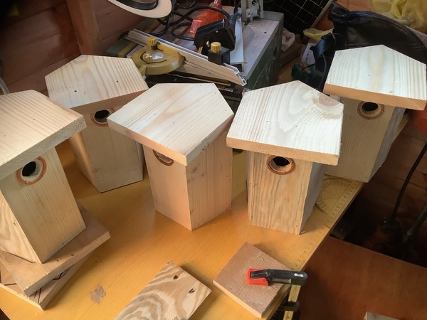 I want to share Mr. B’s bird boxes with you, he is good with his hands, he was an engineer before retiring and spent a long time drawing up plans! We will be giving them away to friends and family once we’re able to get out and about.