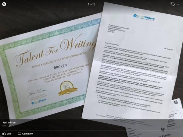 GD has been awarded a certificate by the Young Writers Group? It will be published, so proud, as is her Mum, these young people are amazing, she’s 13. I’ll post a picture, but since my new phone, they post at the wrong angle?