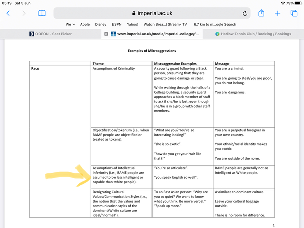this tidal wake of woke nonsense has to end, many of those fighting these ludicrous battles dont seem to know what they`re fighting for anymore, Just take the new advice handed to university lecturers at Imperial college london, They have been told not to compliment foreign students on their english, .Apparently it could be considered a racist micro aggression. how absurd !