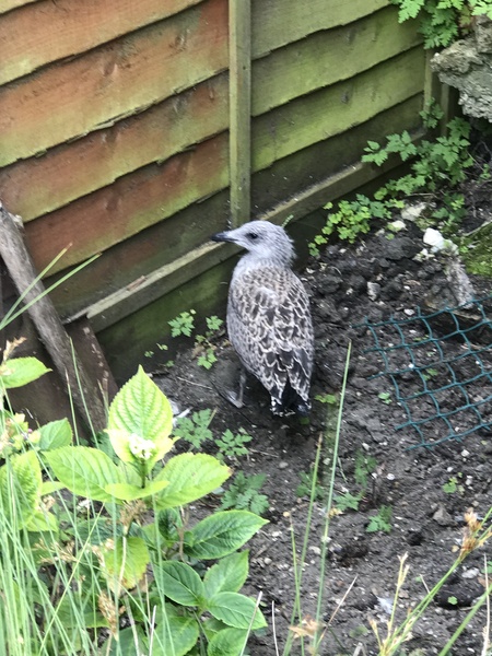 Well this morning at 4 am I heard the familiar squeak squeak of a baby seagull I thought oh dear a baby s on the flat roof again, I hope the mum knows and I went back to sleep when I got up at 7 I could still hear a muffled squeak and opened the chimney trap door and could see a very very young seagull on the little ledge above… so arm in and popped her out into the bedroom Shes much smaller than Stephen and I was really worried she wouldn’t be old enough to feed herself I put her in the garden with some sardines and water and mum was circling around above screening at me I was hoping she’d come down and get her or at least feed her