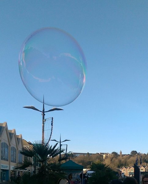 Good morning from a sunny south Cornwall, where I overnighted on my son's wonderfully comfy sofa. Fun yesterday making gingerbread biscuits of all shapes, including helicopters and sharks, with my 11-year-old grandson. 'I've missed doing this with you, Nana,' he said in his slightly croaky, grown-up voice. Such a sweet-natured boy, though strange to see him maturing so rapidly. His dad was much later reaching puberty. To Truro today for black knitting yarn for a sloppy joe for me. Last time I was there the bubble in the photo floated past me all on its own. No obvious owner.