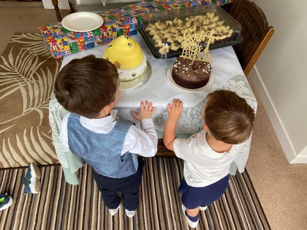 We’ve had a lovely couple of days away and yesterday celebrated Barnaby’s baptism.It was a lovely service and he was so good, just one loud Oi when DD tipped him back and the priest poured the water over his head!Hopefully I have attached pictures of the view from our hotel window and one of B and H looking at the cakes.Vegan chocolate cake for H and a bee cake for B!