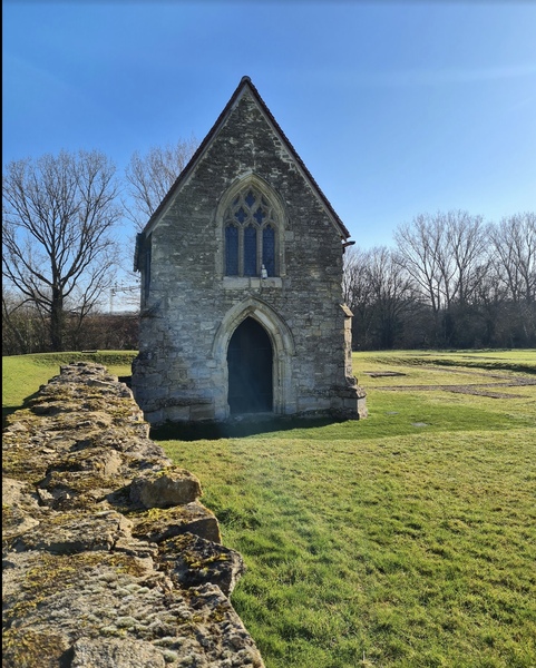 It’s been a lovely sunny day here- I was at a Golden Wedding lunch in a medieval barn near MK and we were milling (?) about, well chatting outside and then between the main course and dessert we were invited to take part in a guided walk round the remains of the abbey and inside a tiny little 14th century chapel .