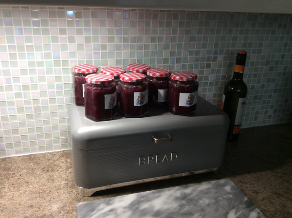 2 kilo sliced red onions, half kilo brown sugar, half litre red wine vinegar together in large pan. Boil furiously until onions soften and reduced liquid (10 mins), stir in 4tbsp golden syrup, then pot and label! DH has added ‘Don’t give away’!