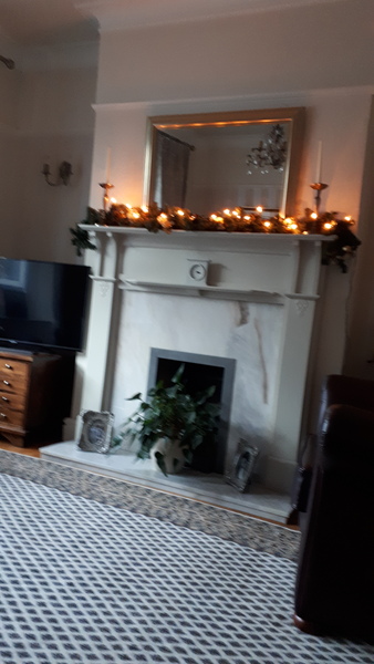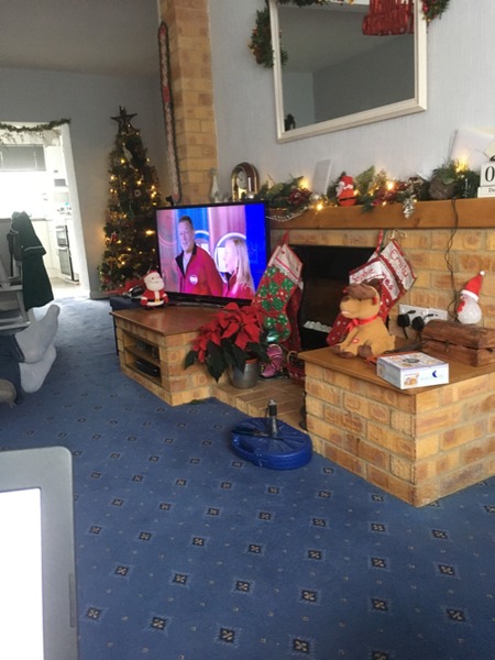 Inside the front door in our home is a frame holding an "All Blacks" Rugby Shirt (bought in person from NZ) and a string of chimes in the form of bells! The second door into the Hall is closed, so the Cats can't get out when the front door is opened, but once inside - there are lots of prints and paintings on the walls, a hall table (cluttered with a telephone, any medical appointment letters, Hand Sanitiser, a desk tidy with pens and notepaper etc.) and a small bookcase, overflowing with books that are too big for it! Right beside the bookcase is a narrow Christmas tree, and on the other side of the hall table is the feeding station for our cats! You will also see lots more doors, as we live in a Bungalow, so everything leads off from the hall! It's brightly lit, as I'm partially sighted, and you would be very welcome to a cuppa.