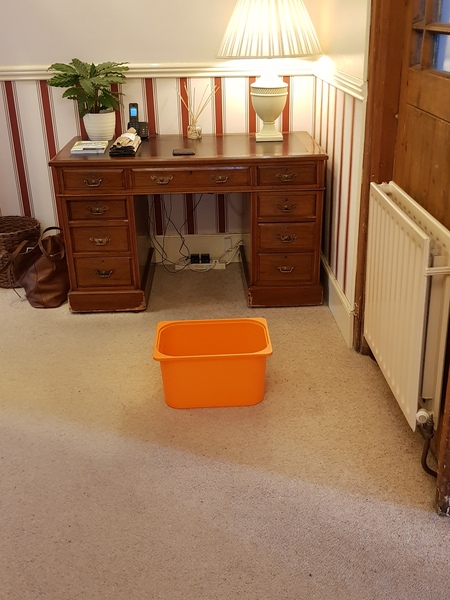 The hall pre renovation - you would not have been invited in! The orange box is for catching rain - obvs!!
