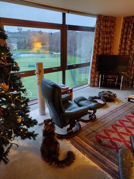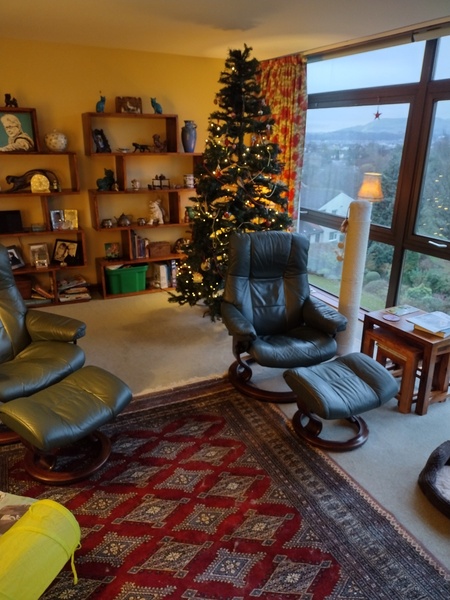 Here's our sitting room from two angles complete with cats and their toys. No apologies for mess -its their home too!