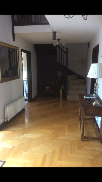 A warm tidy hallway, leading towards the kitchen area. That door is closed but as it’s 3/4 way glass, you will see a giant one year old lab and his 3 year old spaniel companion doing synchronised jumping and barking.