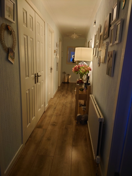 This morning it is a sheet of ice on the pavement and road outside my wee hoose. So I took the photo of my hall from inside. The other view is as you turn into lounge. Kettle just boiled and I have a nice granary loaf to toast. Come on in for a blether.