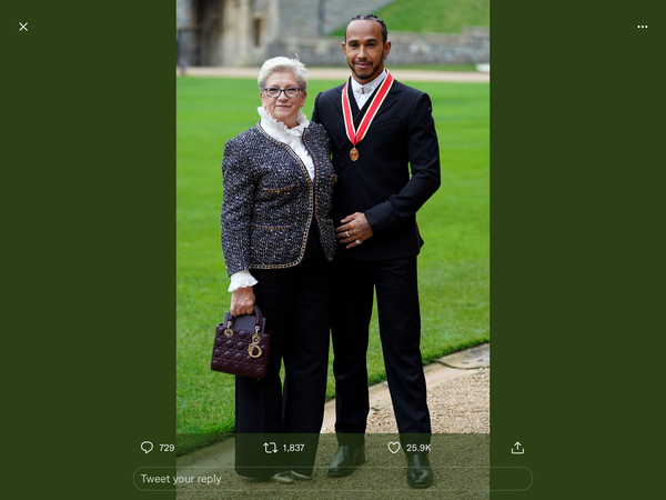 Lovely to see Lewis Hamilton knighted, he is a young man who has achieved so much. Great to see he took his mum to the ceremony I’m sure she was super proud. She’s dressed to head to toe in Chanel, I like the outfit apart from the frilly blouse, but maybe that’s just me. Anyone else agree?