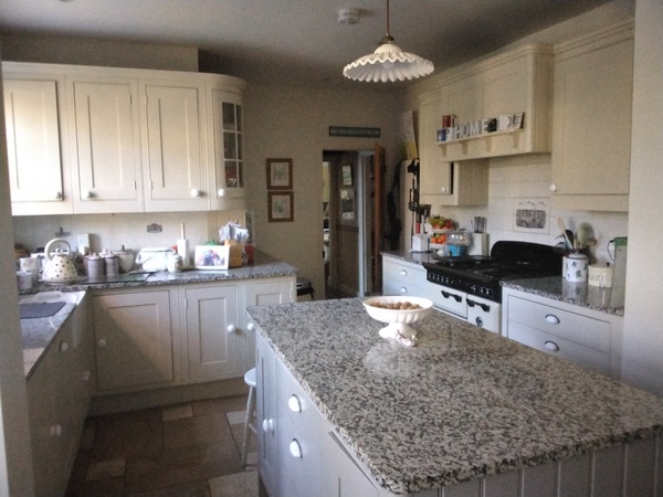 We love our Neptune shaker style kitchen made of wood that can be painted over if scratched, (they leave a pot of paint for this purpose) complete with lamps and shelves and china sink. After 8 years of use, it has stood up brilliantly and is very cosy but so smooth to use.