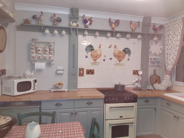 I recently had my original late 50s kitchen replaced, and had a bonus little bit of extra space as a hot water tank was removed from the cupboard under the stairs. I'm really pleased with the outcome, not enough space for an island but room for a dishwasher and a tumble dryer which it didn't have before . It's a simple shaker style one, no built in appliances as I preferred to have a wider choice of what I got. Cream, simple shaker style cupboards with a sort of mottled dark textured counters, and led lights under the wall cupboards. A touch of colour in the tiles, sort of greeny, bluey, greyish, warm pale blue paint. The laminate flooring is pale greyish wood but it looks more silvery than grey. The cupboards remind me of a victorian kitchen in a house I lived in when I was a child, although the colours were slightly different