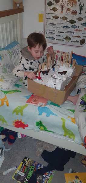 Good morning from an overcast, very mild south Cornwall. Allotment knitters' group this afternoon at a community cafe on the sea front. This morning more painting; thinking I may add some collage. Reading The Year of Living Danishly by Helen Russell. Entertaining. Last night this pic of four-year-old polystyrene sculptor arrived. Bless him. Have the best day you can.