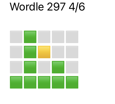 Very happy with 5 after my failure yesterday. Wordle 297 5/6