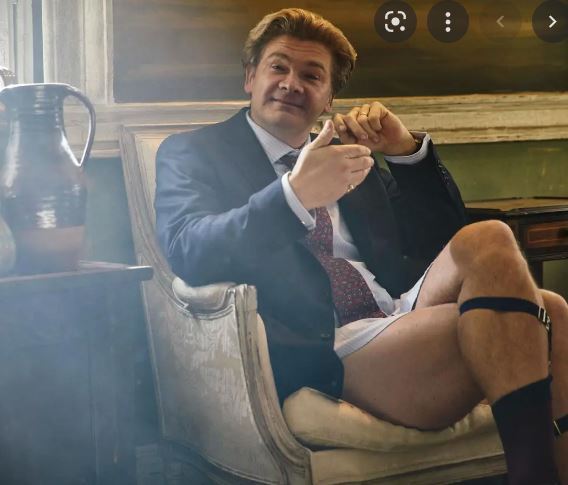 She’s sitting on a grass ledge, her legs are hanging down, not under her dress.