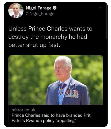 Royalty especially our future king should keep out of politics. Charles is playing into the hands of the Republicans and possibly making a few more on the way.