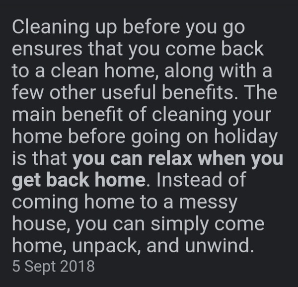 We go on our holidays the following day but almost burn ourselves out ( well I do ) by cleaning , washing, hoovering the house the day before !!!!