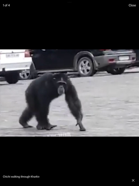 A CHIMPANZEE that escaped from Kharkiv zoo was yesterday wheeled home on a bicycle after strolling around the war-torn city