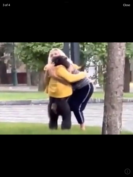 The pair embrace before it tries to get its arms through the sleeves