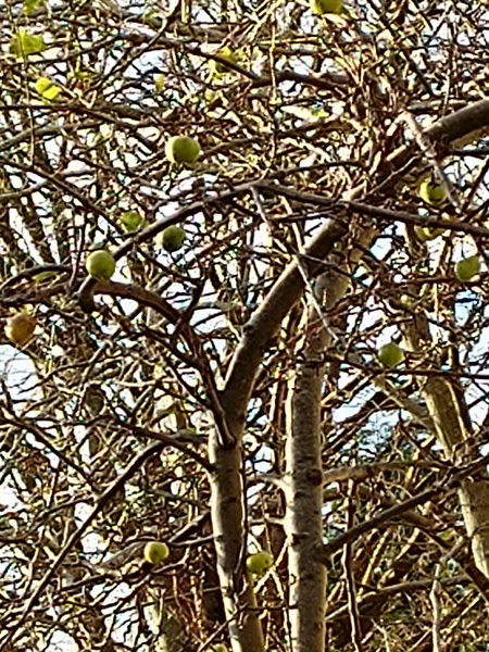 I spent ages yesterday trying to get a photo of the mistle thrush on the apple tree. I failed but here's my tree which is my version of a bird feeder.