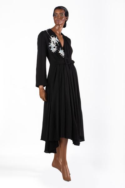 2021: Giorgio Armani: Black triple silk georgette dress with deep front, lotus flower embroidery. As worn by Meghan, Duchess of Sussex. Selectors: Ibrahim Kamara and Gareth Wrighton.