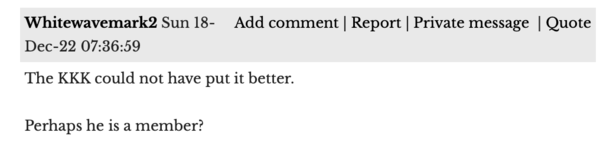 His columns will be read and subedited to pick up on just that sort of thing, and there is zero chance that this slipped through unnoticed. In any case, whether the KKK thing was recognised or not, the comment is way beyond acceptable in its own right. He is vile and IMO should be sacked for this.