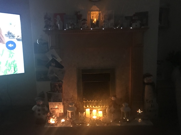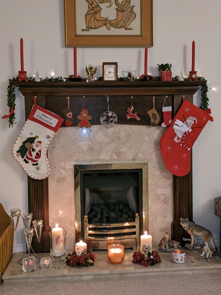 Enjoying my fireplace this evening with the Christmas candles lit. Must remember to blow them out at bedtime!