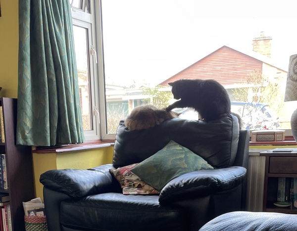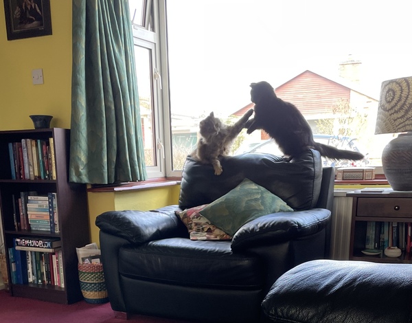 Hello all. I’m sat on the sofa with Ripley who was turfed off the back of the chair by Milo. She knows that Milo likes to sit on the left! I was supposed to drive our daughter to the station in Oxford, but I developed a migraine. The sun is very bright. So OH has taken her. He is taking ages as there are road works on the main road. He should have come back a different way, but forgot! I think he has bought a couple of pizzas for dinner although I cooked a massive spaghetti bolognaise for lunch. Here’s a photo of Milo and Ripley fighting!