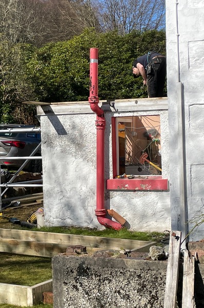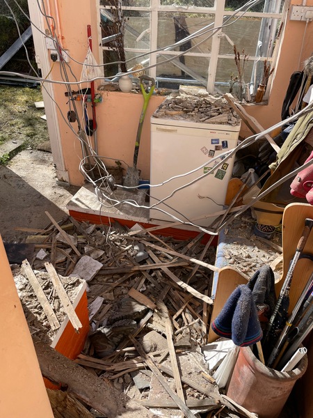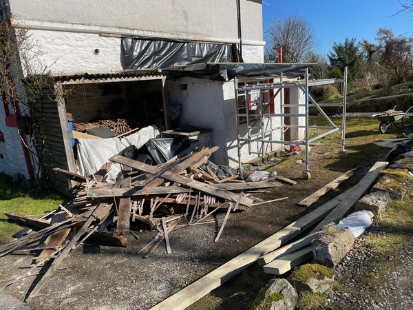 The state of our mud room yesterday – roof off, ceiling down, temporary roof on, rain getting in at the sides where tarpaulin isn't tight enough to, fortunately, the ouside house wall. Pouring down today so the joiner will be back "next dry day" which could be a week away....