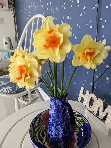 However, let us not forget the gratitude and it was so lovely to see this clump of glorious daffodils in the garden yesterday. They were being flattened by the wind and were too beautiful to leave there, so I brought them indoors where they will be appreciated. The person who had this house before us was a great lover of daffodils and the garden is full of many different kinds, even after 25 years. These are my favourites so I hope you enjoy them too.