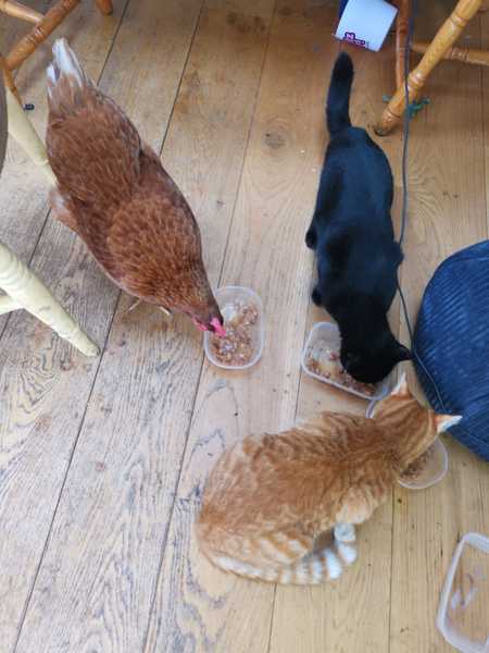 When I saw the heading, I thought you were commenting on the chicken eating a frog or mouse she had caught. They are omnivorous and will certainly do so if they get the chance (see hooked beak), However I was wrong and have enjoyed reading about all the loving and well loved chickens and cats.