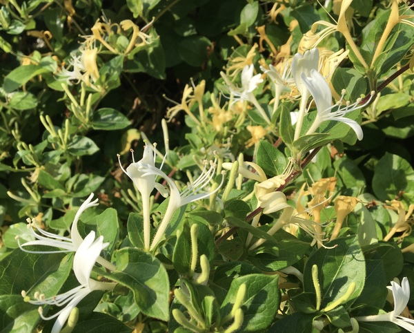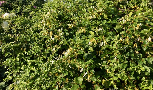 We have two big clumps of honeysuckle in the garden hedges and this year they’ve gone mad! The smell is wonderful, especially at night when we’re eating outside. The bees love the honeysuckle and the roses too.