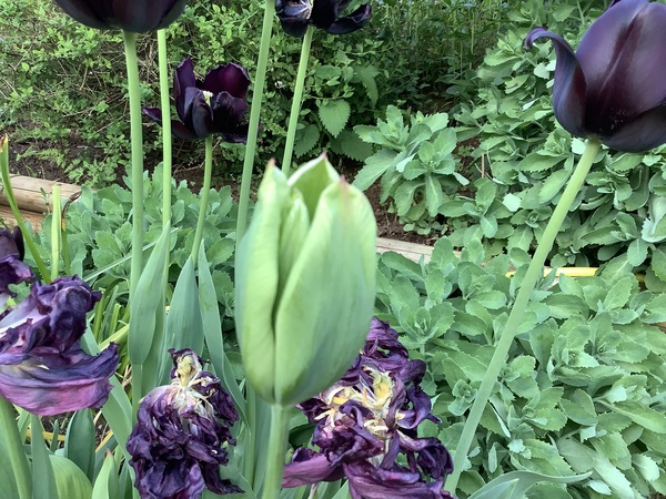 Look at this, have you seen anything like it before? It is in a pot with some parrot tulips which are now over, and some very dark ones - but just this one came up green, and has thick petals, not like a normal tulip. I don’t think it will make me a fortune, but it’s interesting.