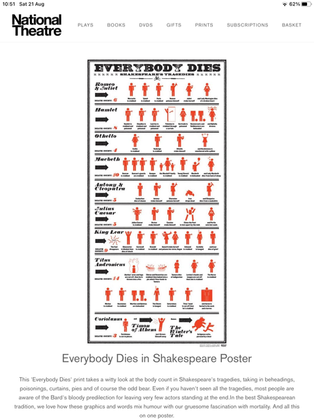 I hope this is legible - it’s a poster issued by the National Theatre to show how (gulp, hang on to your seats) - actually everybody dies in Shakespeare!